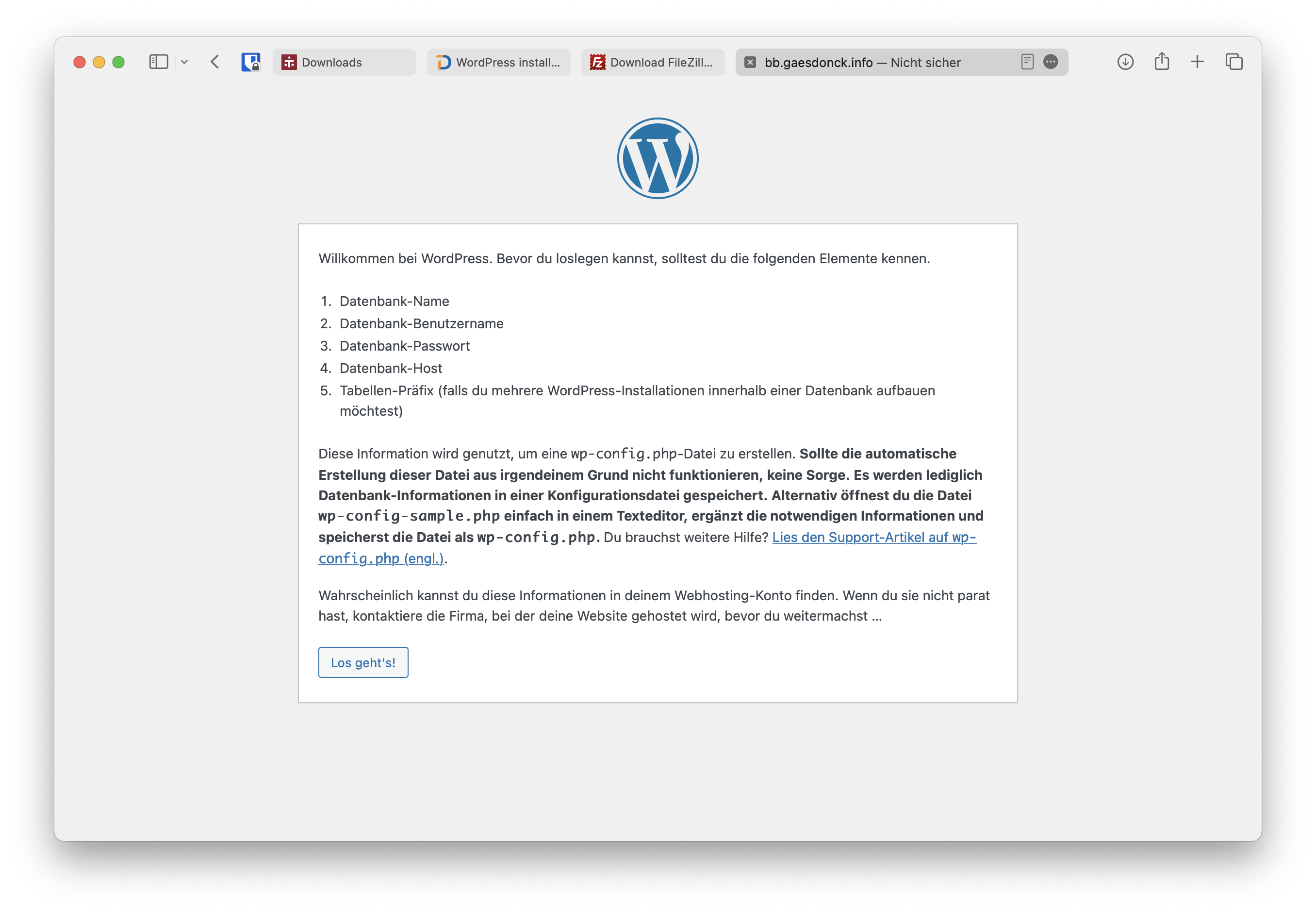 Sobald alle Dateien hochgeladen sind, können wir mit der Installation beginnen. Gehe dazu zu "ihre-domain.com/WordPress".
